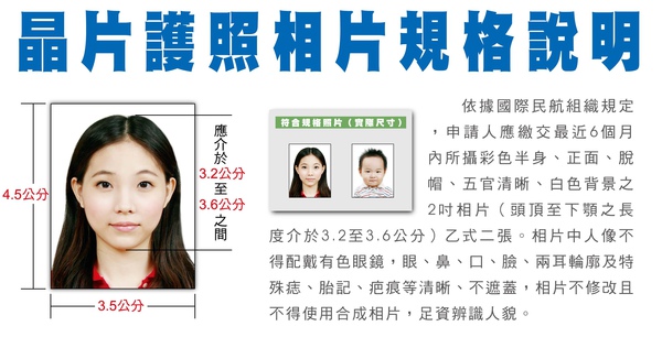 白色背景之護照專用相片乙式二張。 (照片規格如下圖)