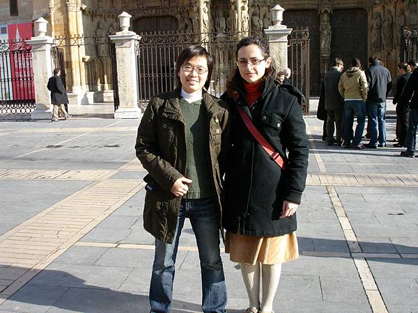於León與一朋友(Esther)合影,身後為León大教堂。Dec-2007.