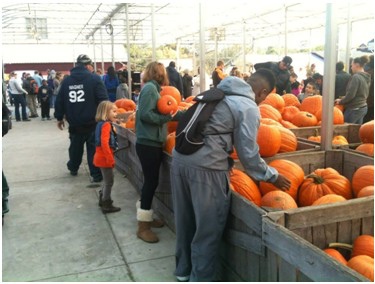 學校很貼心的安排我們在感恩節的時候到校友家吃感恩節大餐,體驗美國恩節文化。火雞是感恩節的傳統主菜,通常是把火雞肚子裡塞上各種調料和拌好的食品,然後整隻烤出,此外,南瓜派也常作為輔食。感恩節宴會後,有時會玩一些傳統遊戲,比如南瓜賽跑是比賽者用一把小勺推着南瓜跑,規則是不能用手碰南瓜,先到終點者獲勝。比賽用的勺子越小,遊戲就越有意思。他們還會將火雞胸部的叉骨取出,兩人各執一端,默念心中的願望,直到其折斷,拿到較長一端骨頭的人的願望就會實現。每年感恩節的次日,被稱作黑色星期五,通常美國的購物場所都會以比平時低很多,所以很多人在團聚之後都會舉家出動,晝夜排隊以求購買到物美價廉的商品,這也逐漸成為了一種新的習俗,而我當然也在購物的人潮之中。